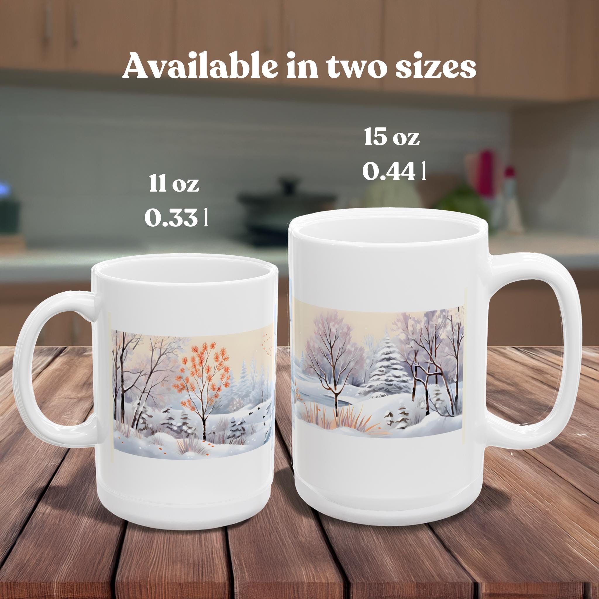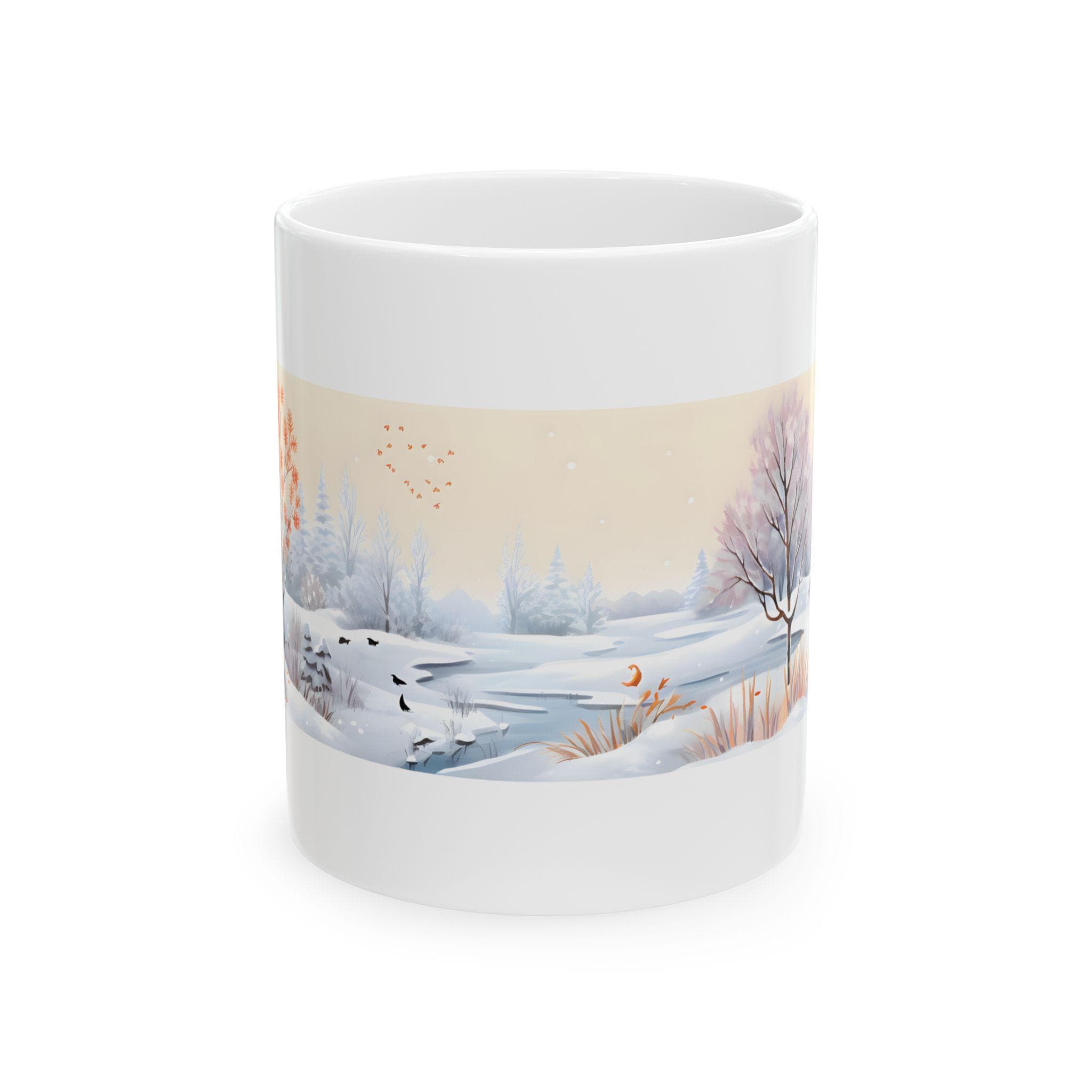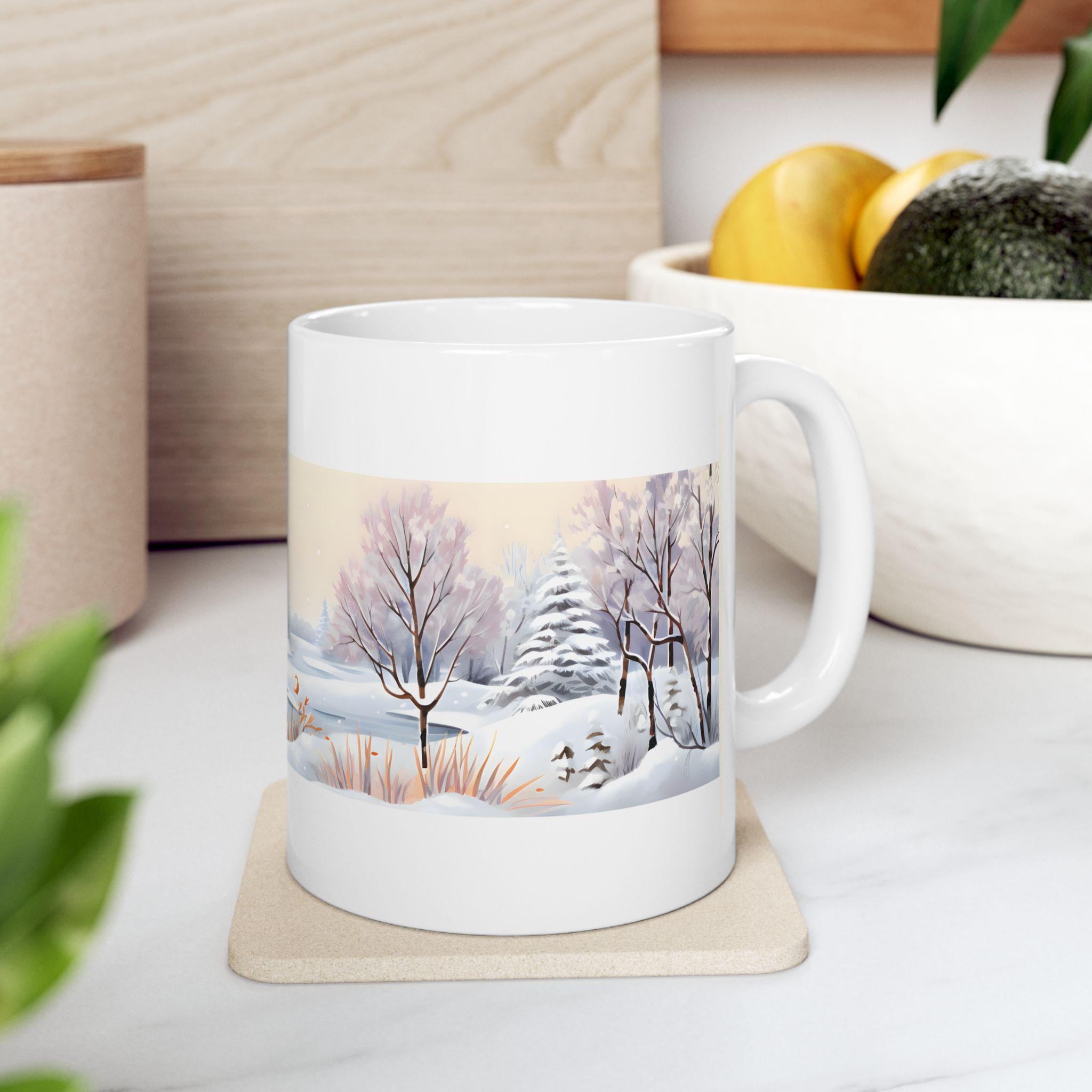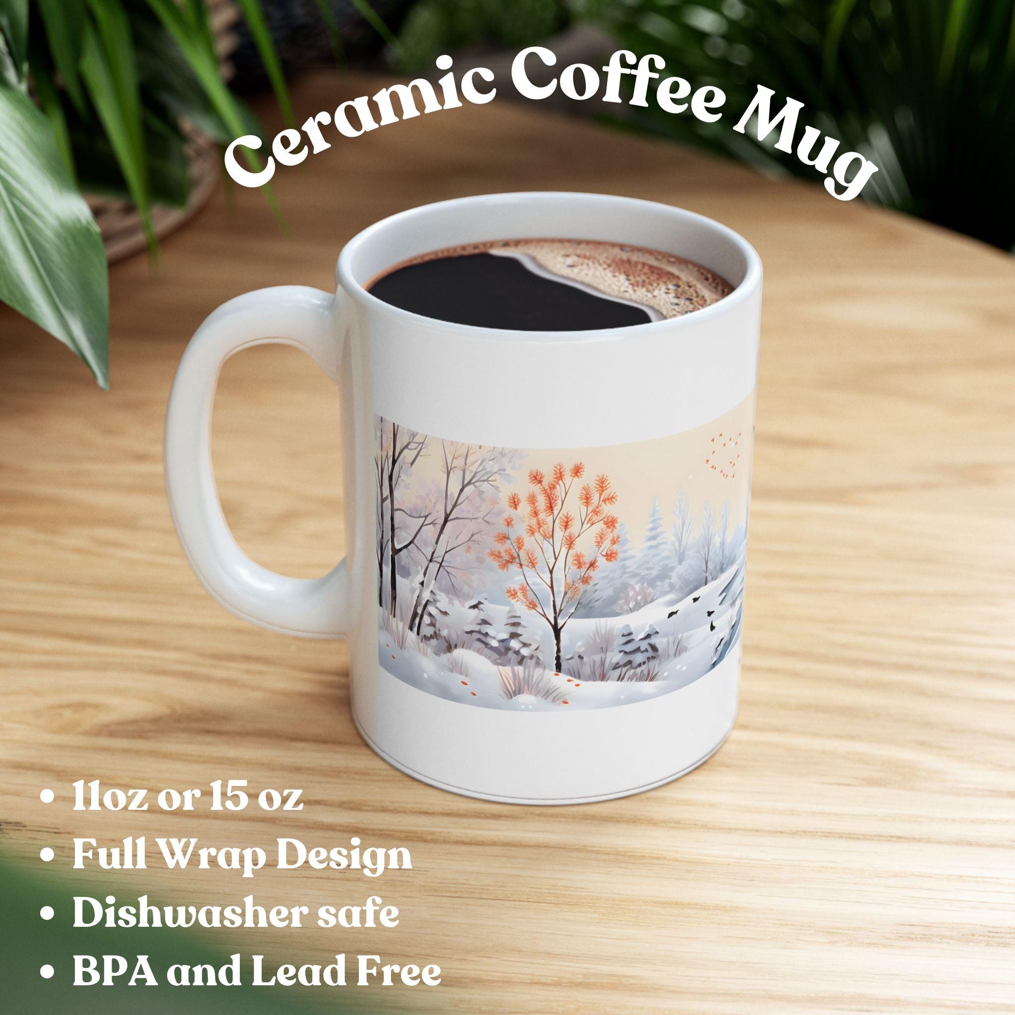 Gaze upon a winter stream as you enjoy your favorite beverage from this colorful ceramic coffee mug. Savor the peaceful, calm feeling to start your day. It’s BPA and Lead-free, microwave & dishwasher-safe, and made of white, durable ceramic in 11-ounce and 15-ounce sizes. This is a perfect holiday gift for coffee, tea, and chocolate lovers.