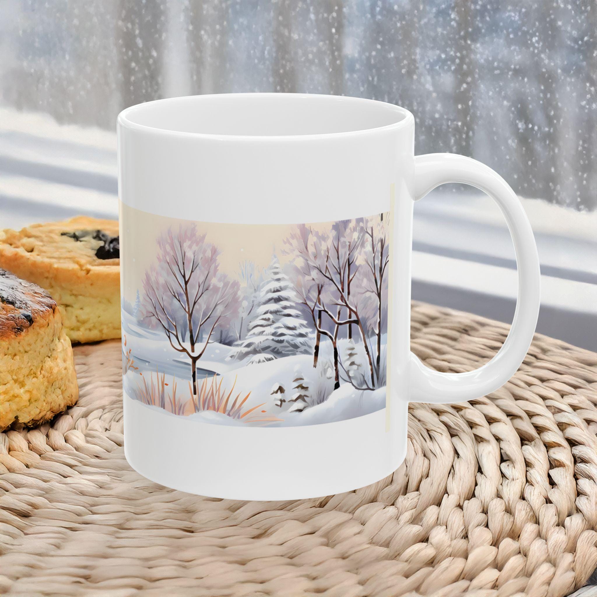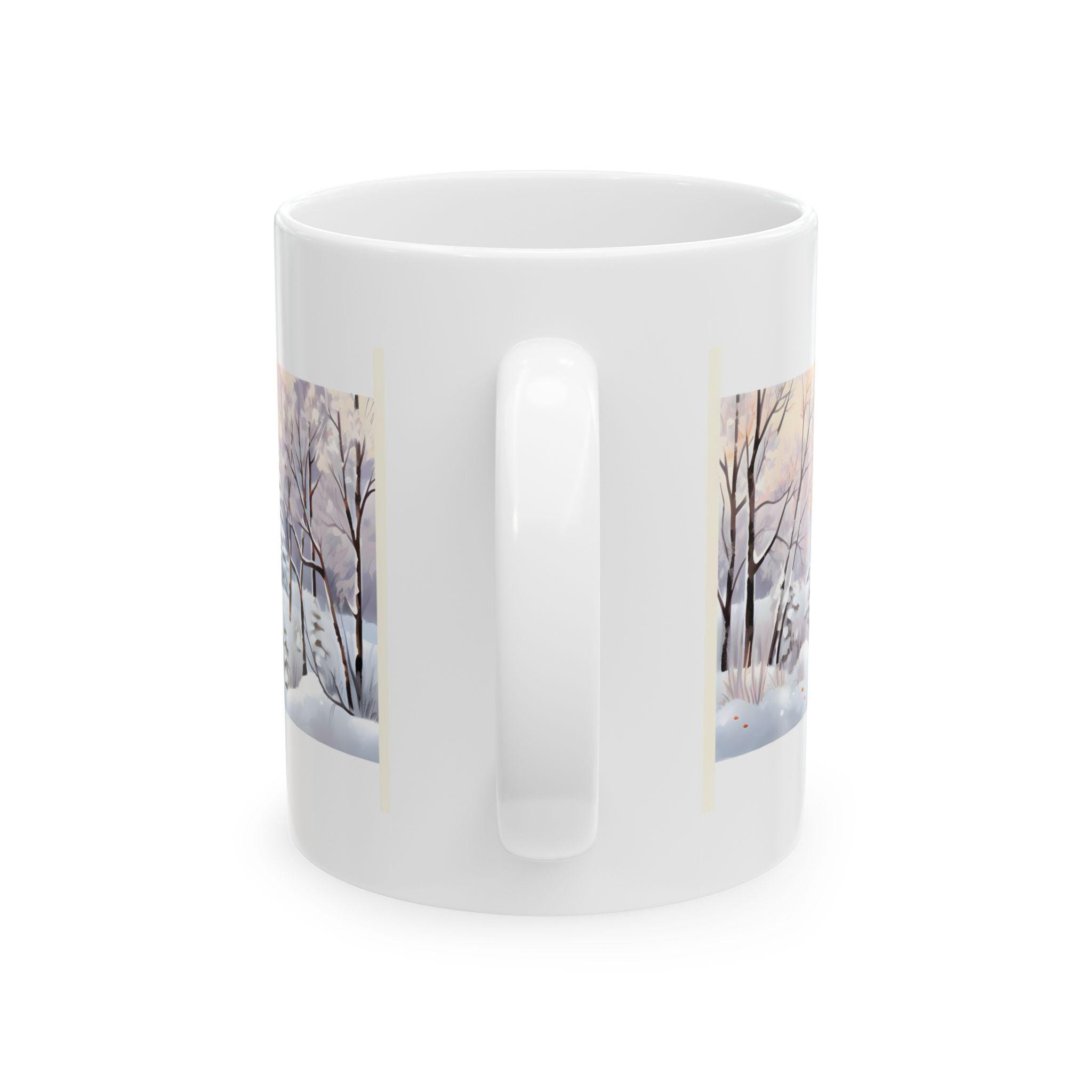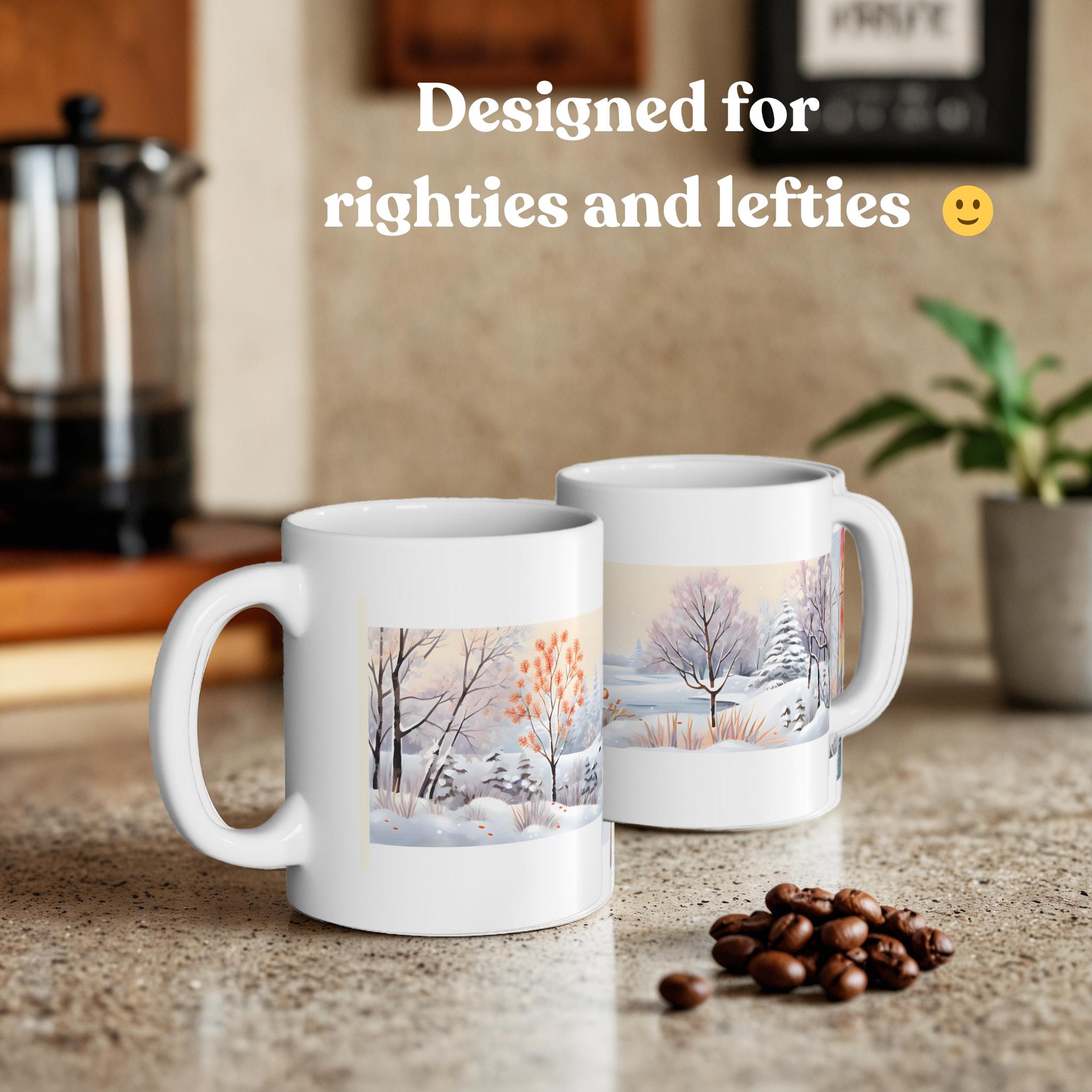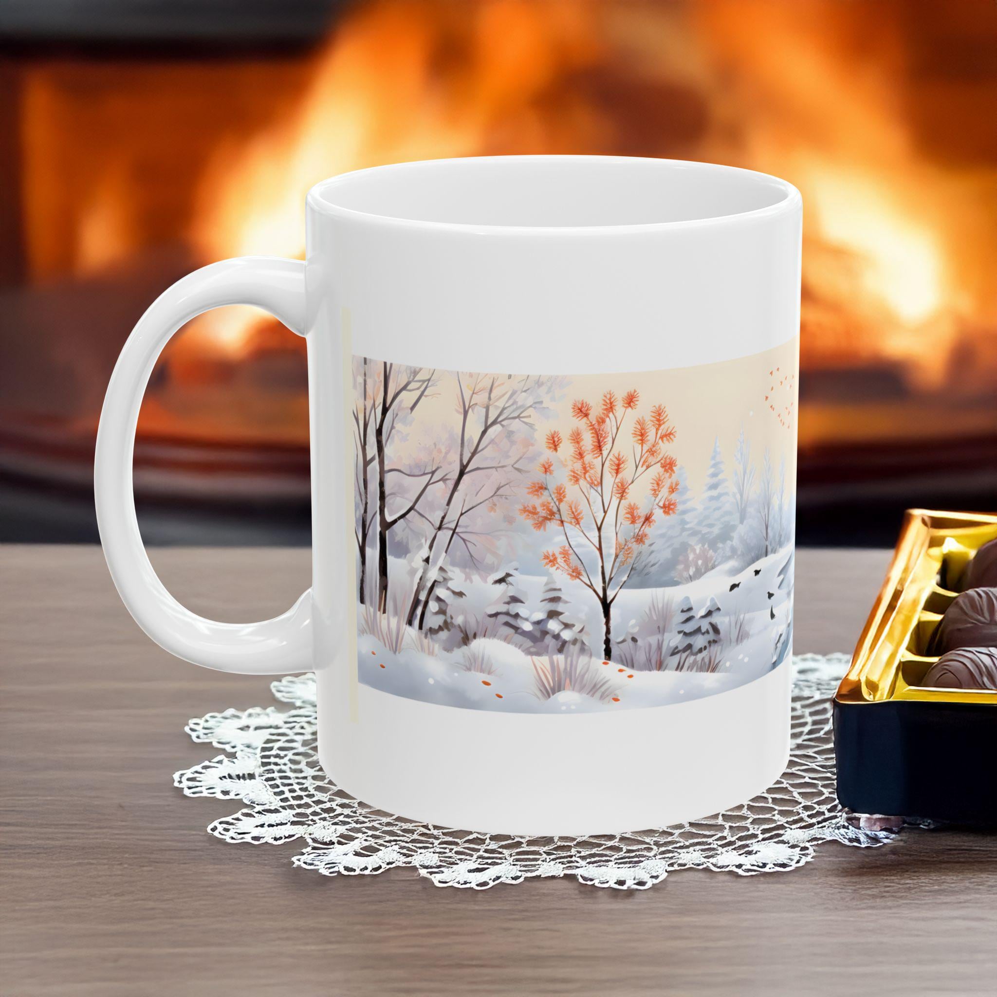 Gaze upon a winter stream as you enjoy your favorite beverage from this colorful ceramic coffee mug. Savor the peaceful, calm feeling to start your day. It’s BPA and Lead-free, microwave & dishwasher-safe, and made of white, durable ceramic in 11-ounce and 15-ounce sizes. This is a perfect holiday gift for coffee, tea, and chocolate lovers.