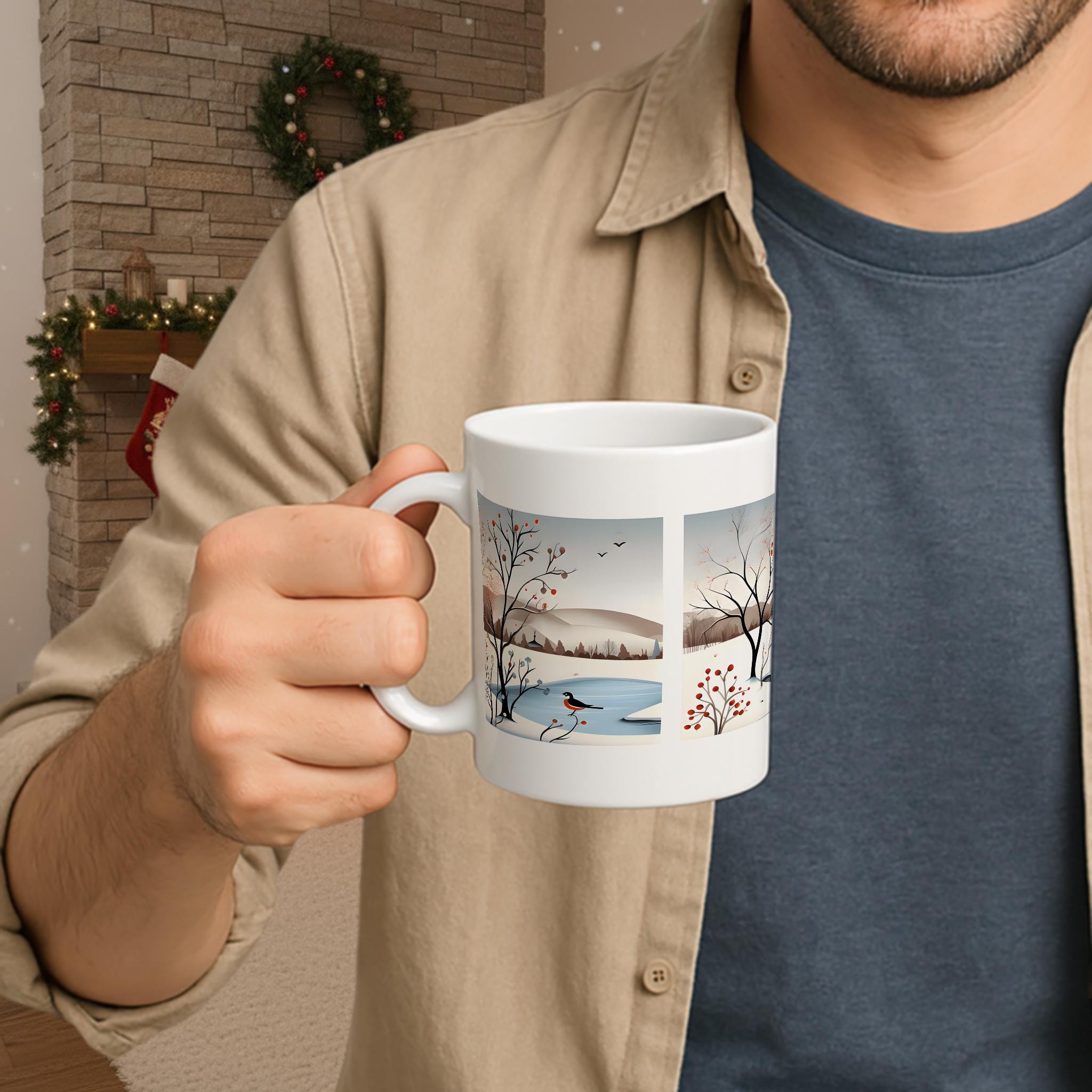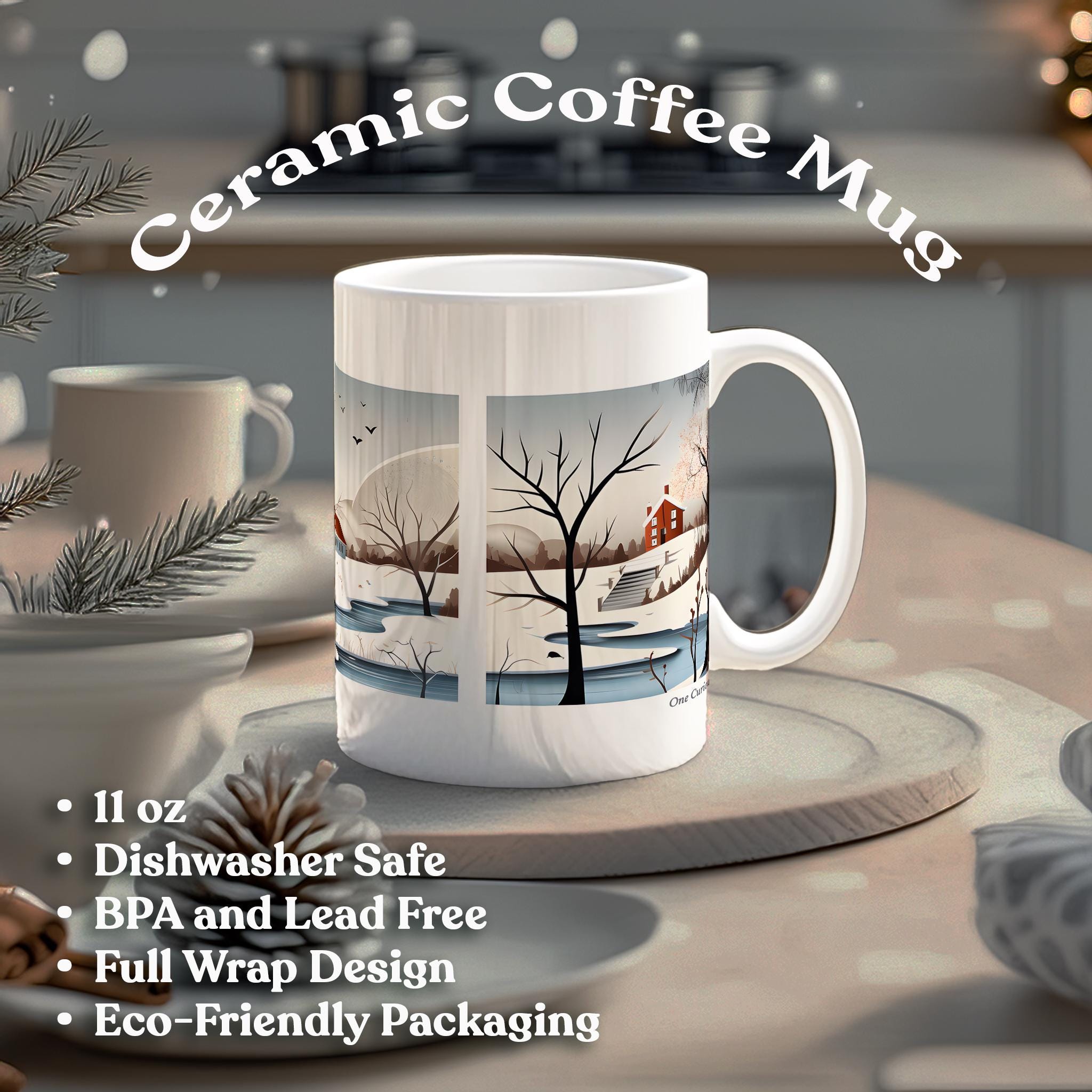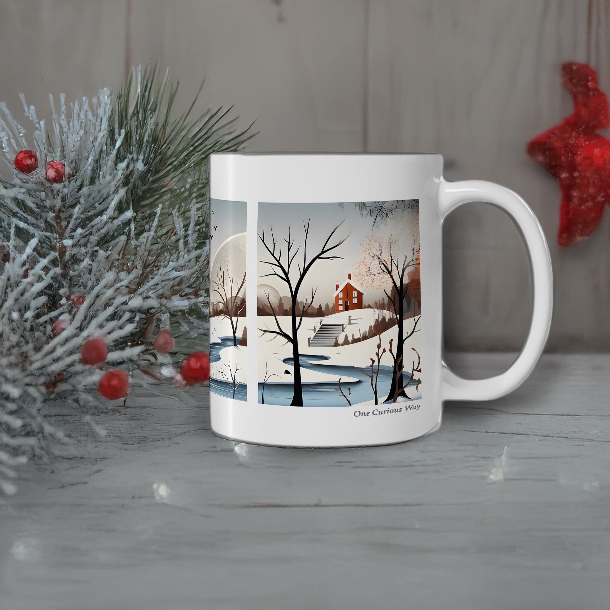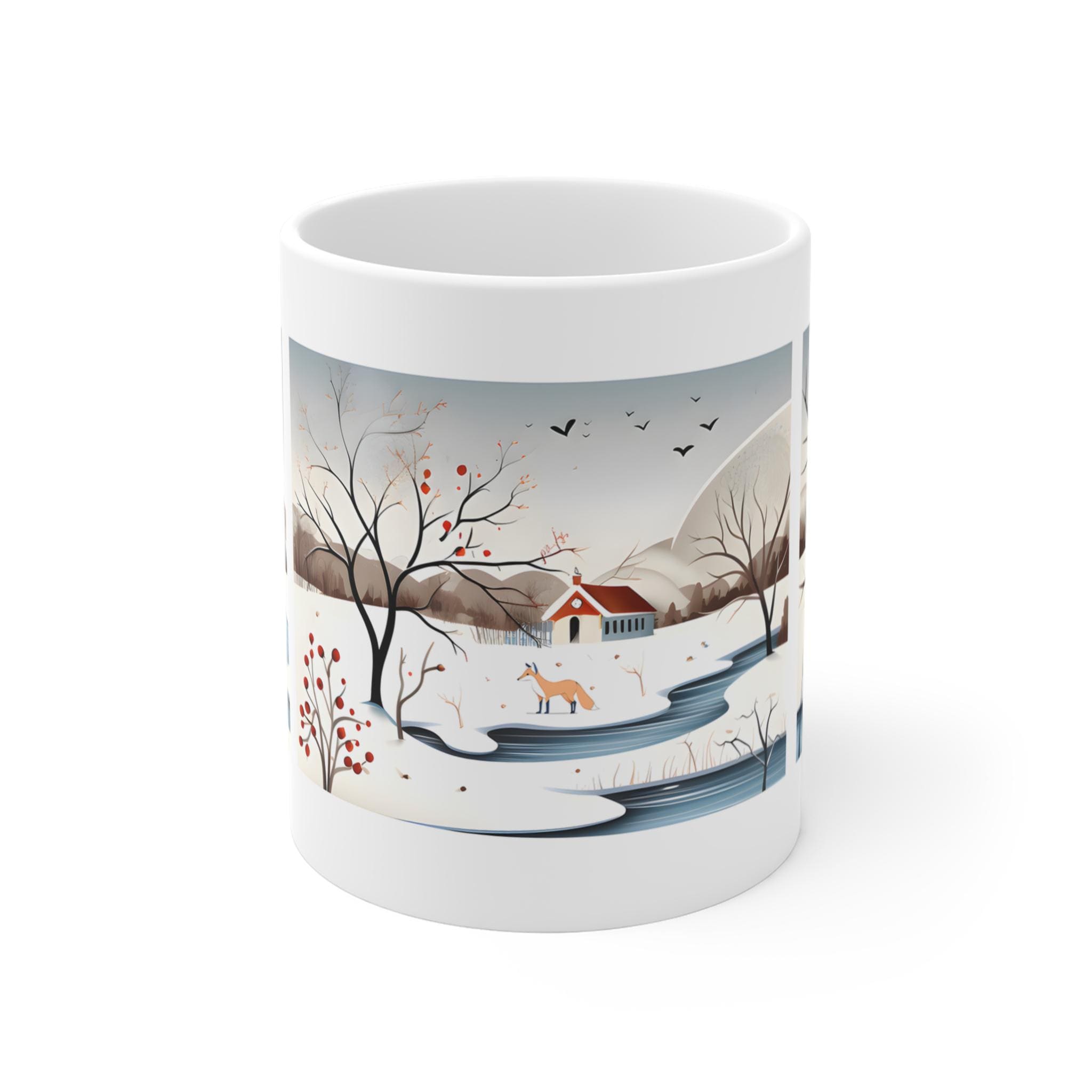 Bring the charm of nature to your morning routine with this cozy ceramic mug featuring a beautifully illustrated winter scene. A red cottage sits among snowy trees, while a fox and woodland animals roam through the peaceful countryside — creating a calming start to your day.