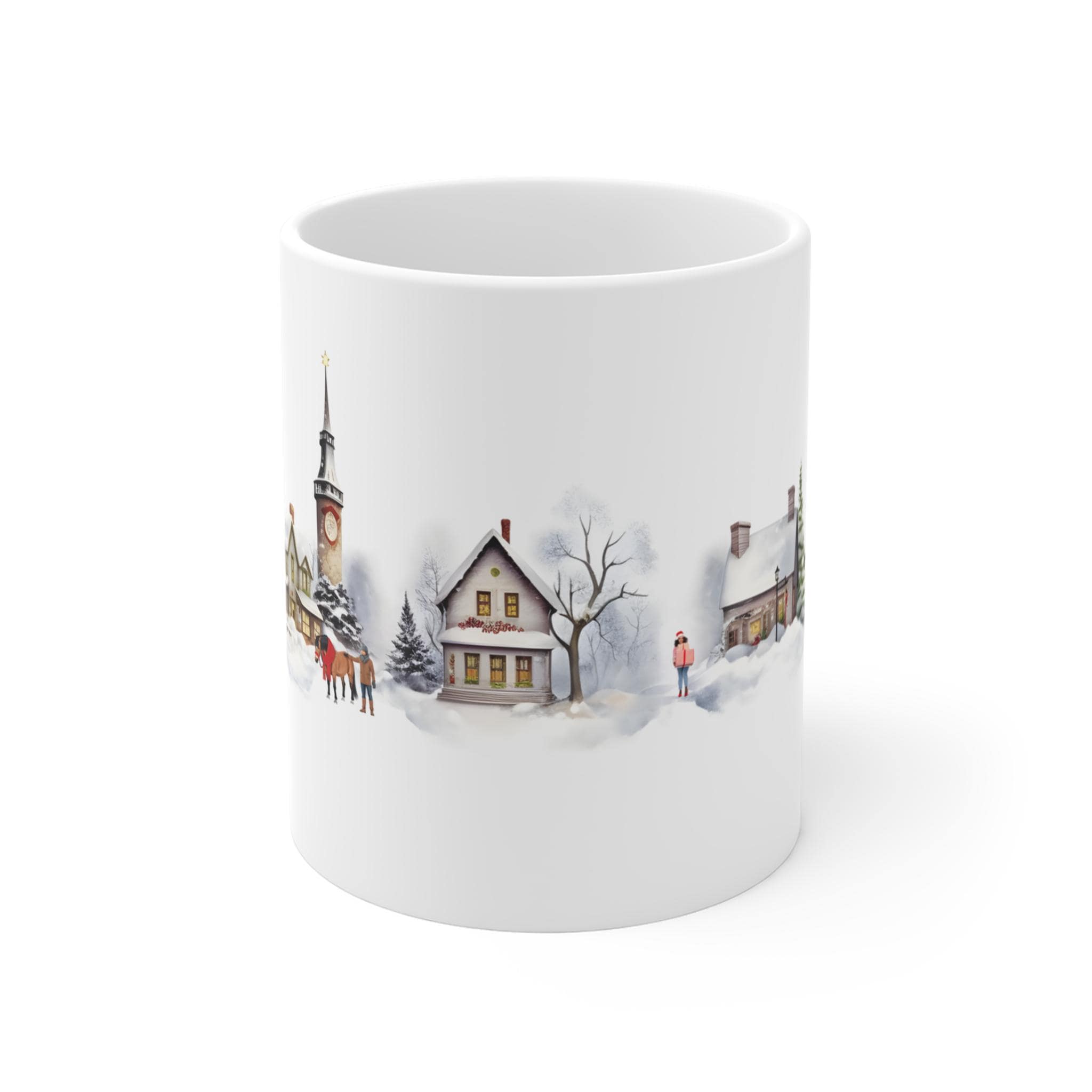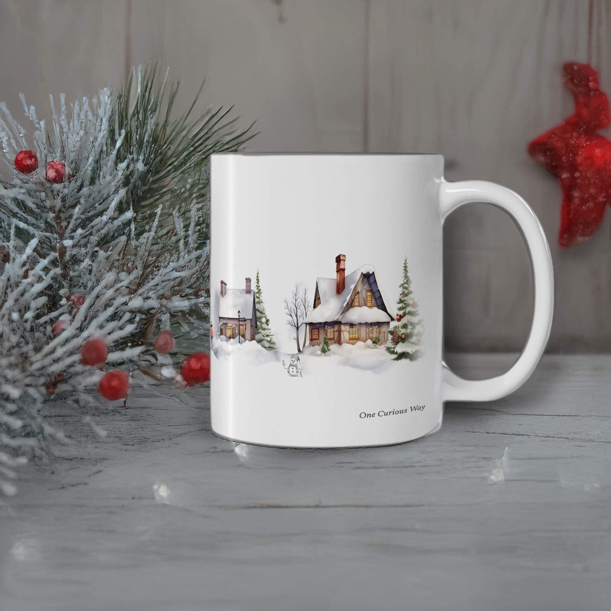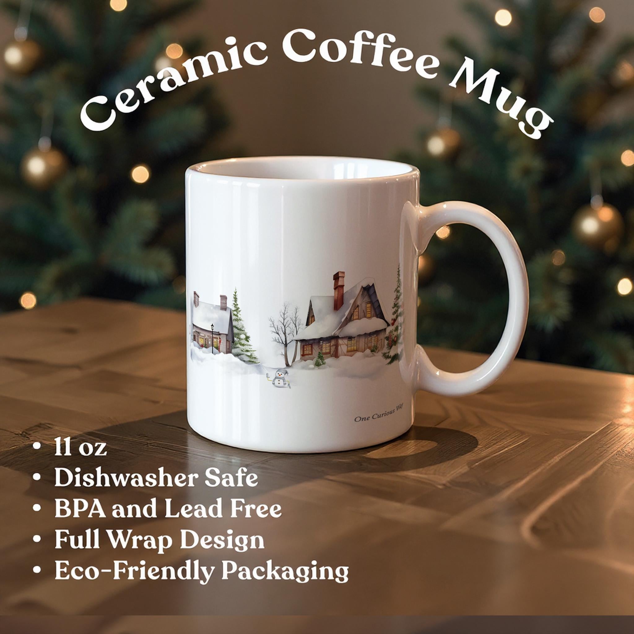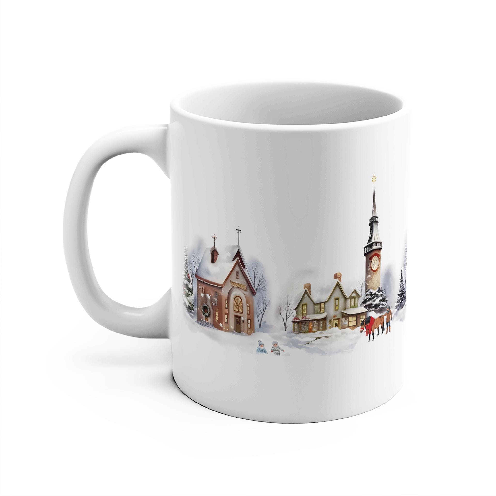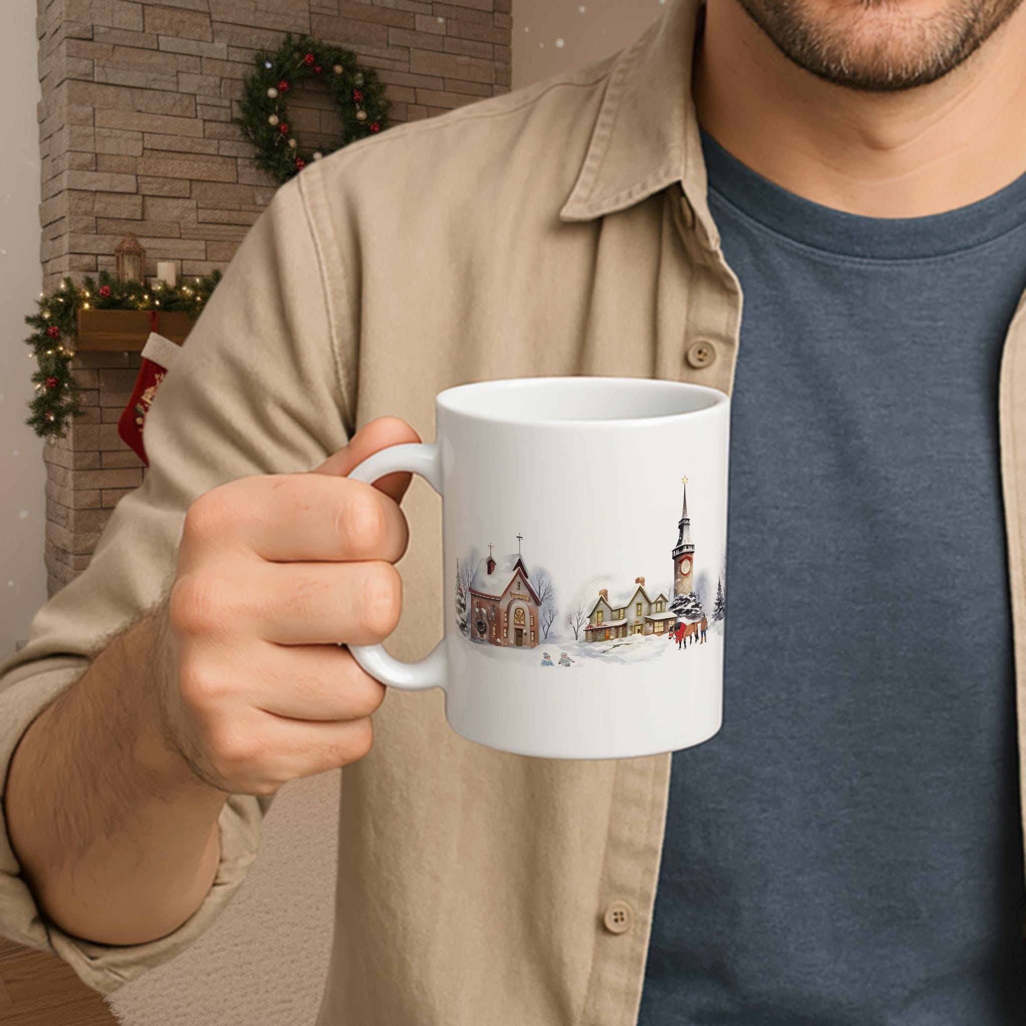 Start your morning with a touch of holiday charm. This ceramic mug features a peaceful winter village with snowy cottages, a festive church, children playing, and a warm Christmas glow in every window.